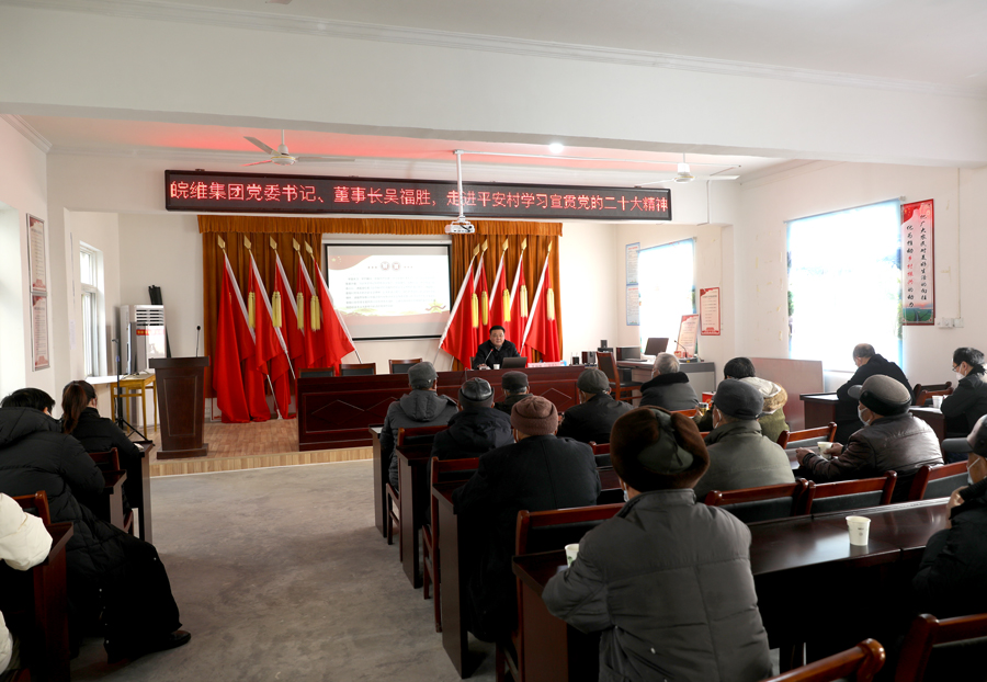 12月30日是2022年最后一個工作日,皖維集團(tuán)公司黨委書記、董事長吳福勝不辭辛苦,從繁忙的事務(wù)中抽身,前往槐林鎮(zhèn)平安村,為平安村黨員宣講黨的二十大精神,調(diào)研全年鄉(xiāng)村振興工作。集團(tuán)公司黨委副書記張正和,公司辦公室、黨委工作部負(fù)責(zé)人陪同。